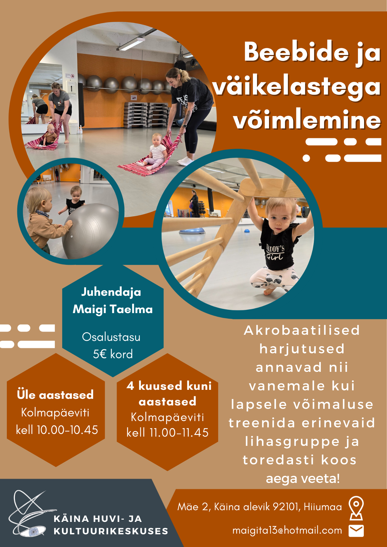 | Beebide ja väikelaste võimlemine koos lapsevanemaga Akrobaatilised harjutused annavad nii vanemale kui lapsele võimaluse treenida erinevaid lihasgruppe ja toredasti koos aega veeta! Üle aastased Kolmapäeviti kell 10.00-10.45 4 kuused kuni aastased Kolmapäeviti kell 11.00-11.45 Juhendaja Maigi Taelma Osalustasu 5€ kord Täpsem info ja registreerimine: maigi.taelma@hiiumaa.ee | ![]() |