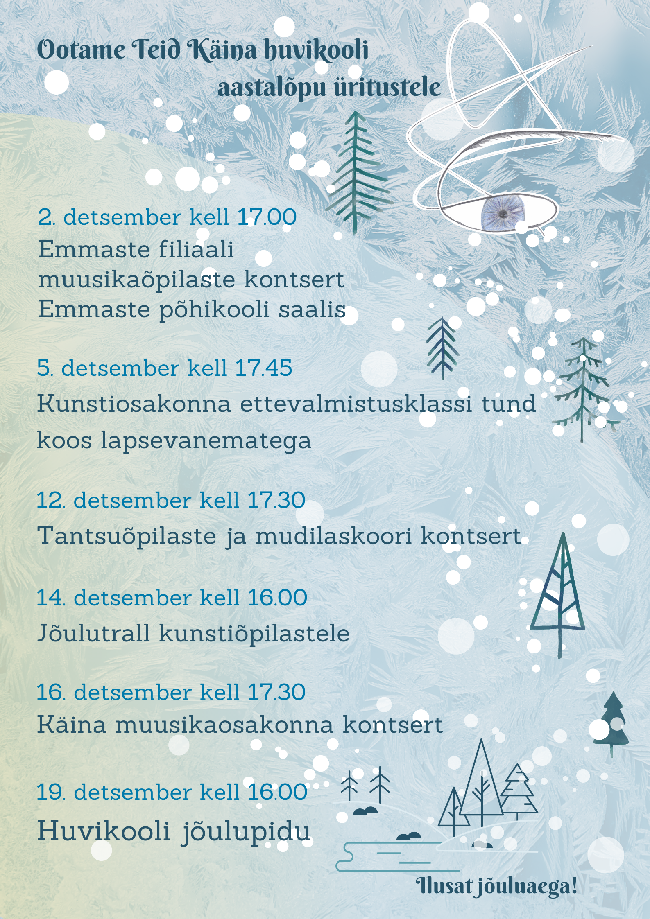 Seoses lumetormiga ei toimu Käina huvikoolis 12.-13.detsembril õppetööd. Täna toimuva pidav tantsuõpilaste ja mudilaskoori kontsert lükkub edasi jaanuari.