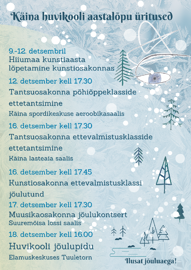 Seoses lumetormiga ei toimu Käina huvikoolis 12.-13.detsembril õppetööd. Täna toimuva pidav tantsuõpilaste ja mudilaskoori kontsert lükkub edasi jaanuari.